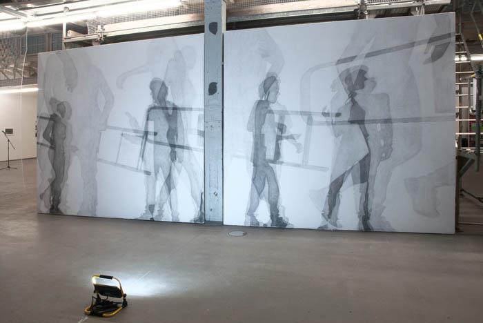 Shadowroom #43 x 6 meter, houtskool op muur en bouwlamp